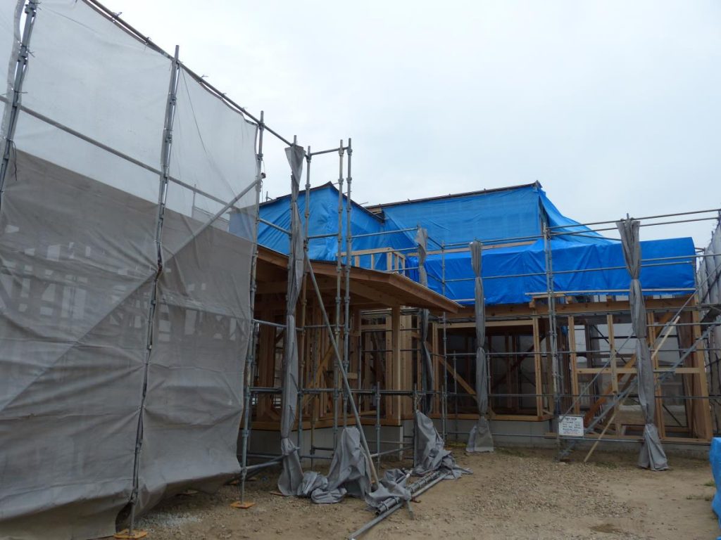 こちらは岐阜市の現場です。こちらでは先日建て方が行われました。店舗併用の住宅になります。現在、大工工事が進んでおり、屋根工事、防水工事、金属建具工事、断熱工事と進んでいきます。