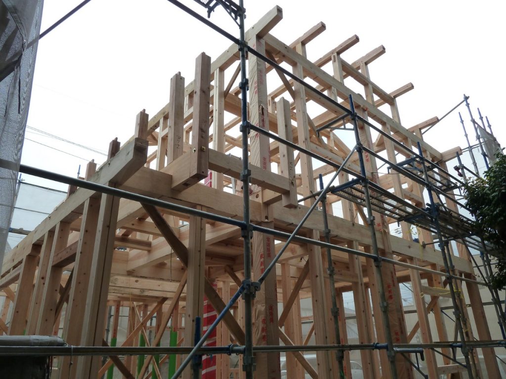 岐阜市の現場です。 こちらでは先日建て方が行われました。ほぼ2日で無事終了しました。 この後筋交いなどが施工され、瓦工事に入っていきます。 瓦は日本瓦一文字葺です。