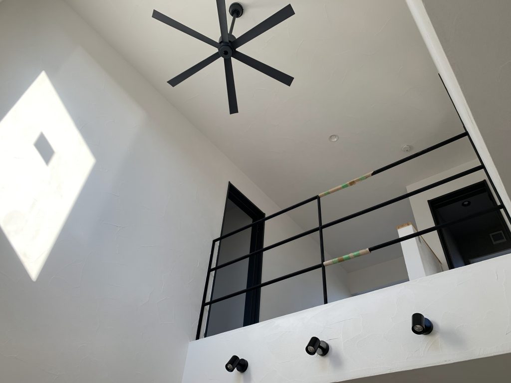 黒のシーリングファンとアイアン手すりの直線が、